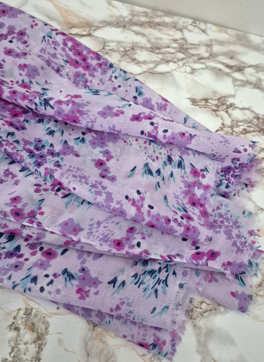 Add a touch of elegance with our Meadow Floral Hijab, a soft cotton-viscose blend featuring delicate pink, purple and blue blossoms on a lilac base with chic frayed edges.