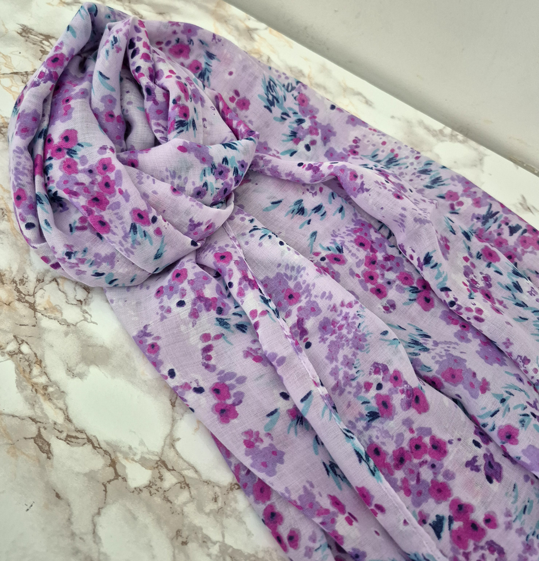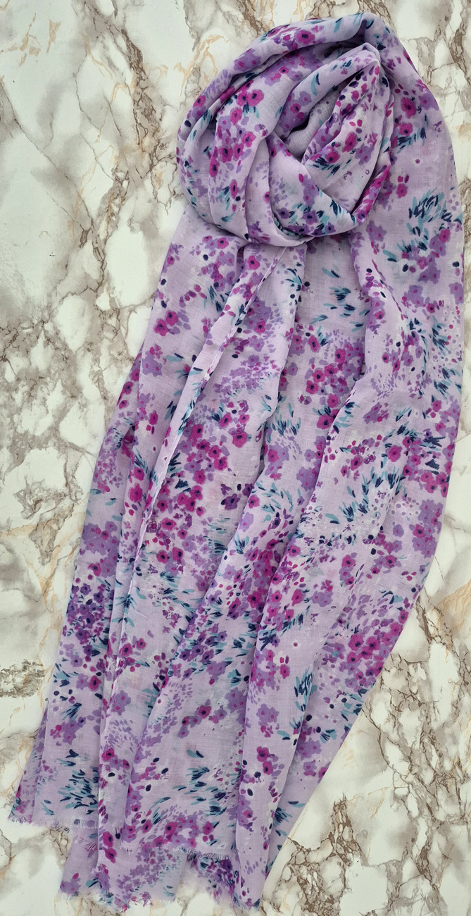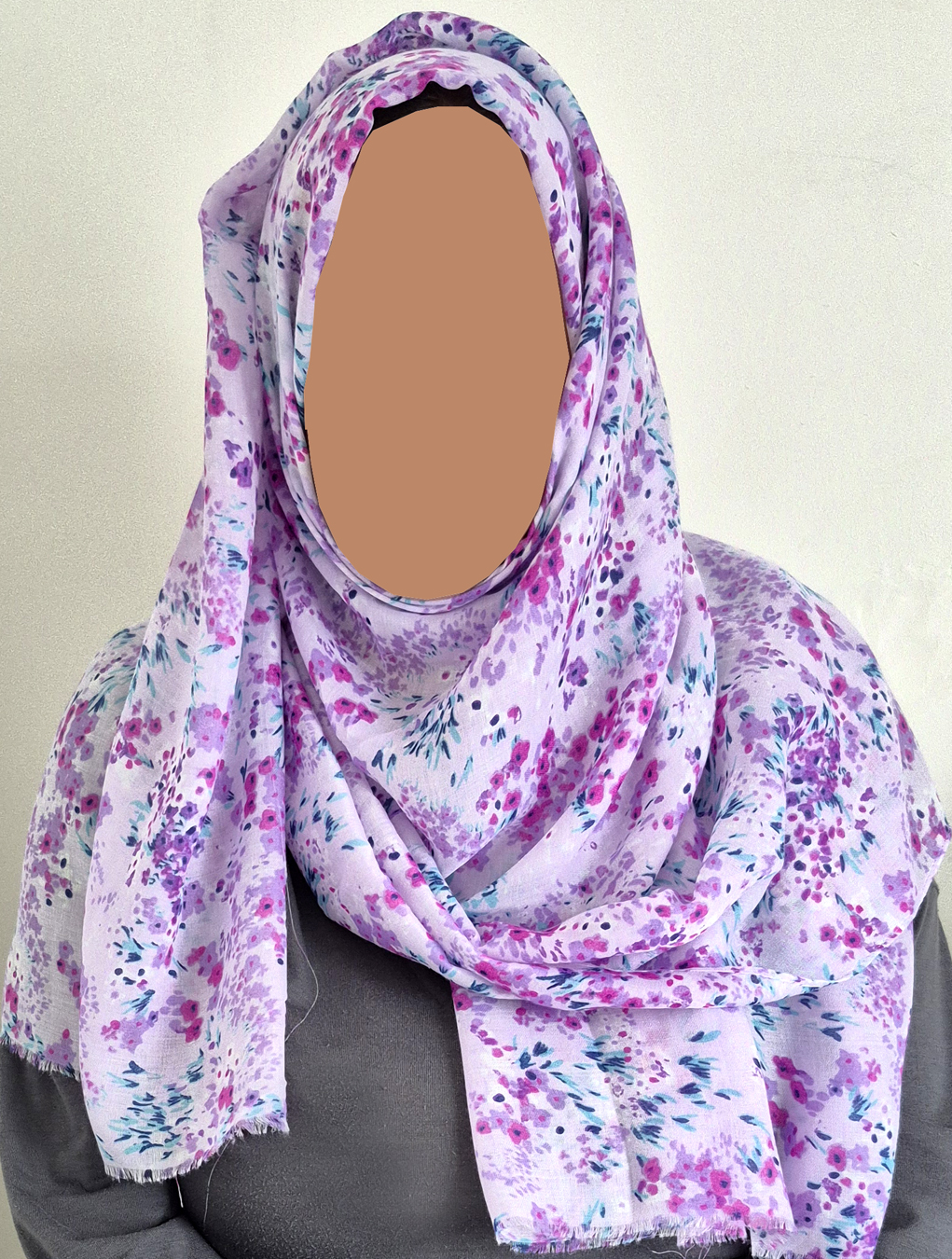 Embrace soft femininity with our Meadow Floral Hijab, featuring a delicate pattern of pink, purple and blue blossoms scattered across a lilac base. Made from a lightweight cotton-viscose blend, it offers the perfect balance of breathability and gentle drape for everyday comfort. The fine frayed edges add a relaxed, effortless charm, making it a beautiful choice for both casual days and special occasions.